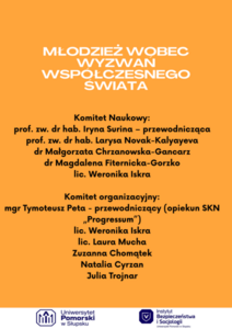 Przygotowane przez Koło Naukowe „Progressum” sympozjum ma na celu zachęcenie studentów do wyrażenia swoich opinii i poglądów na temat młodzieży we współczesnym świecie – a przede wszystkim, wyzwań, którym muszą sprostać. Wydarzenie rozpocznie się o godzinie 10.30 i trwać będzie do godziny 14 – z przerwą pomiędzy poszczególnymi panelami, podczas której dla wszystkich uczestników dostępny będzie poczęstunek. Sympozjum otworzy oraz zakończy prof. zw. dr hab. Iryna Surina, w roli prowadzącego wystąpi zaś mgr Tymoteusz Peta. Serdecznie zapraszamy!