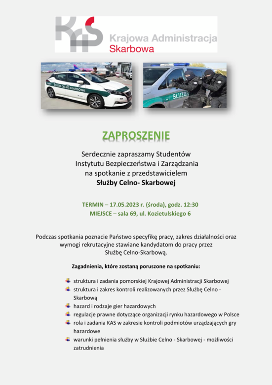 Serdecznie zapraszamy Studentów Instytutu Bezpieczeństwa i Zarządzania na spotkanie z przedstawicielem Służby Celno-Skarbowej
