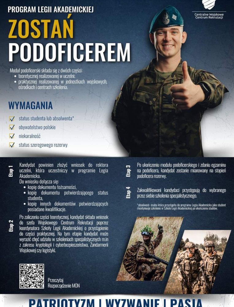 Zgodnie z decyzją Ministra Obrony Narodowej Nr 178/MON z dnia 19 grudnia 2022 r. (Dz. Urz. MON 2022 poz. 204) w sprawie sposobu realizacji ochotniczego szkolenia wojskowego studentów i absolwentów uczelni wyższych w Szkołach Legii Akademickiej wnioski można składać do Pani mgr Joanny Jaworskiej do 31 grudnia 2025 r. w sekretariacie Instytutu ul. Arciszewskiego 22D pokój 19.